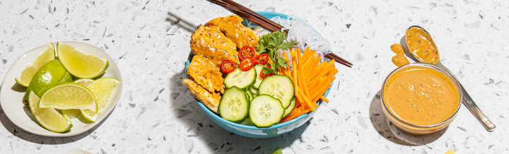 Assemble by filling half a bowl or plate with Miracle Noodles. Add chicken, carrots and cucumbers to your liking.