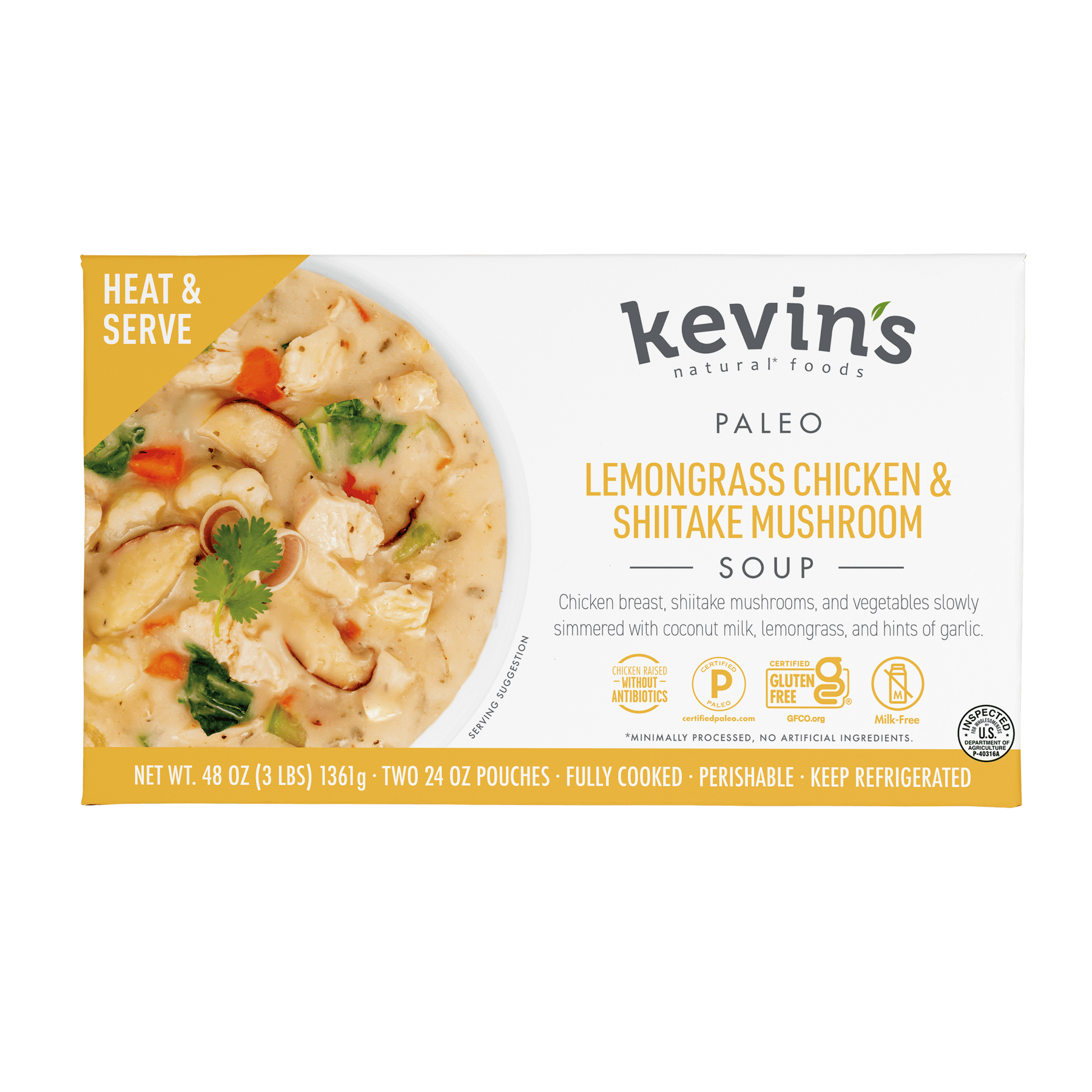 WATER, CHICKEN (BONELESS SKINLESS CHICKEN BREAST, WATER, VINEGAR, YEAST EXTRACT, SEA SALT, CULTURED ONION JUICE, BLACK PEPPER, CITRUS EXTRACT), COCONUT MILK (COCONUT CREAM, WATER), BOK CHOY, ONIONS, SHIITAKE MUSHROOMS, CAULIFLOWER, CARROTS, CELERY, CHICKEN FAT (WATER, CHICKEN, CARROTS, ROSEMARY EXTRACT), LEMONGRASS PUREE (LEMONGRASS WATER), CHICKEN STOCK (CHICKEN STOCK, SALT), TAPIOCA STARCH, YEAST EXTRACT, JALAPENOS, CULTURED ONION JUICE, GINGER PUREE, CILANTRO, LEMON JUICE CONCENTRATE, XANTHAN GUM, SPICES, MAGNESIUM OXIDE, LEMON OIL. CONTAINS: COCONUT.